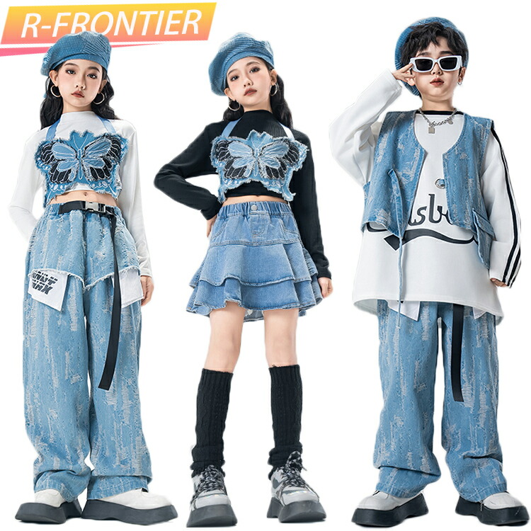 ダンス衣装 ヒップホップ キッズ 青 茶色パンツ セットアップ 女の子 男の子 ベースボールシャツ 韓国 k-pop衣装 かっこいい ジュニア 子供 HIPHOP イベント 発表会 演出服 応援 12