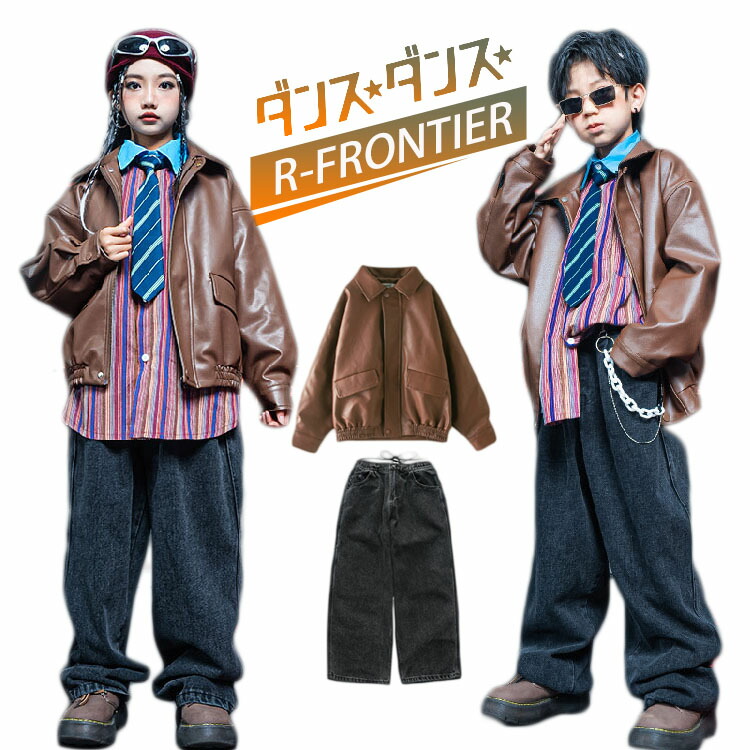 キッズ ダンス衣装 女の子 レザージャケット セットアップ デニムパンツ 縦縞シャツ ヒップホップ かっこいい 韓国 -衣装 ジャズダンス 演出服 イベント 発表会 応援 110 180