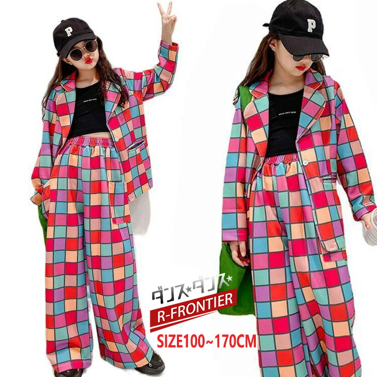 赤 ダンス スーツ衣装 キッズ セットアップ ヒップホップ へそ出し ジャケット カーゴパンツ ダンス衣装 チェック柄 スーツ 刺繍 HIPHOP K-POP 100 110 120 130 140