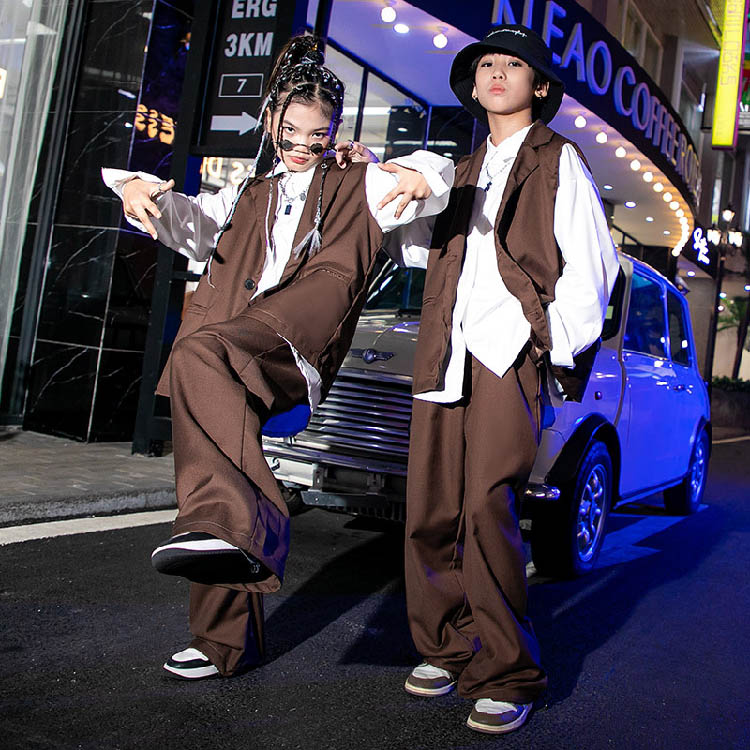 キッズダンス衣装 茶色 ベスト セットアップ 女の子 かっこいい ダンススーツ ヒップホップ 男の子 ジャズダンス 韓国 -衣装 団体 ジュニア イベント 120-180