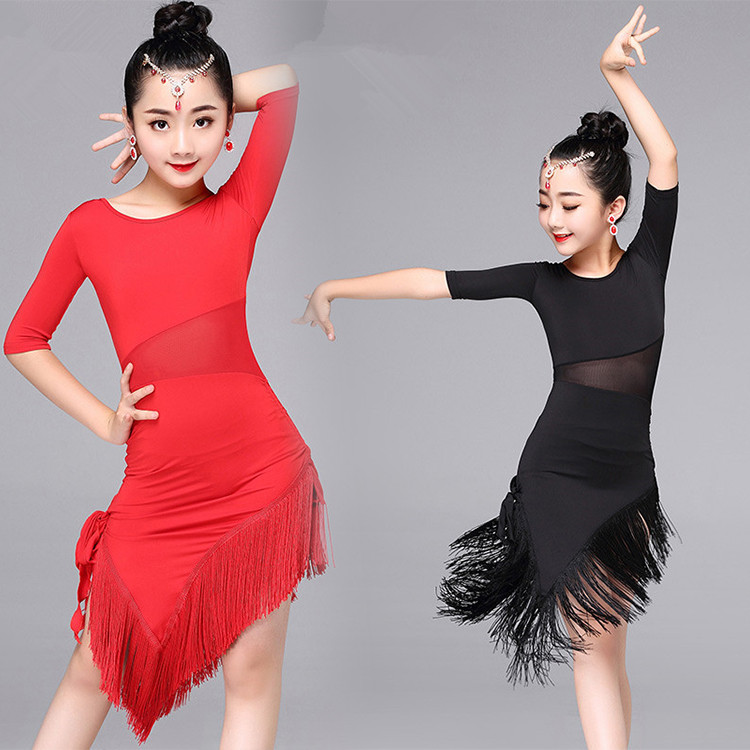 ラテンダンス ワンピース ラテン衣装 社交ダンス キッズ 女の子 高級感 お洒落 豪華 パーティー タッセル 発表会 舞台 競技 練習 演出 ステージ ブラック レッド 110~170