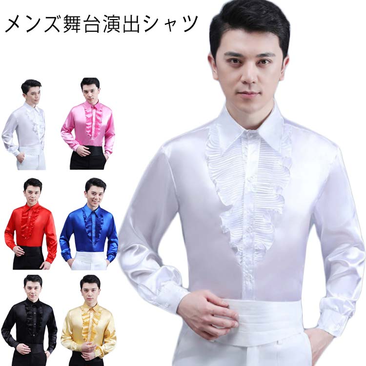 サテン シャツ 長袖 光沢 メンズ ステージ 舞台 ワイシャツ カラバリ 長袖シャツ 結婚式 発表会