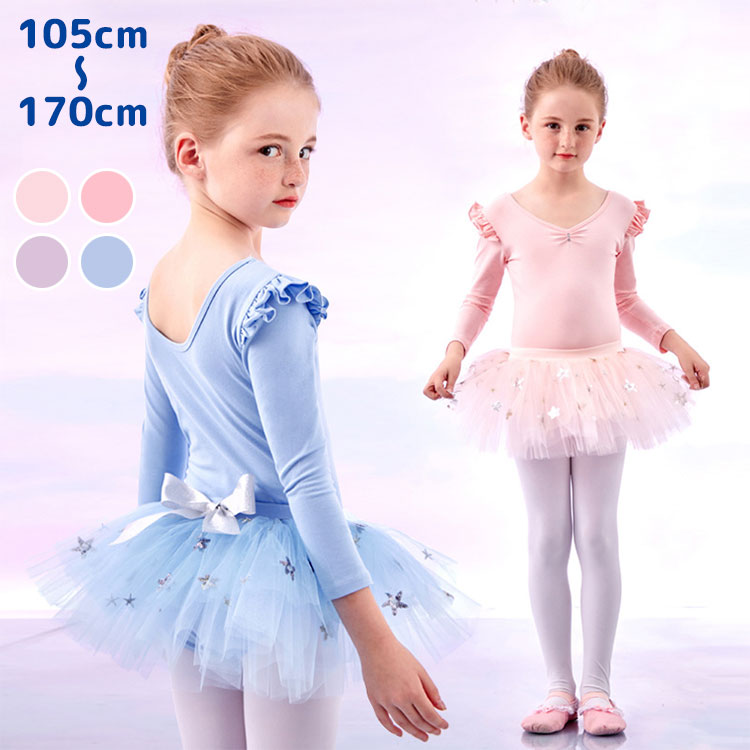 バレエ レオタード 女の子 長袖 チュール スカート キッズ 子供 ジュニア 発表会 おしゃれ フリル リボン お洒落 柔らかい ストレッチ 可愛い バレエ用品 練習 演出 105 110 120 1