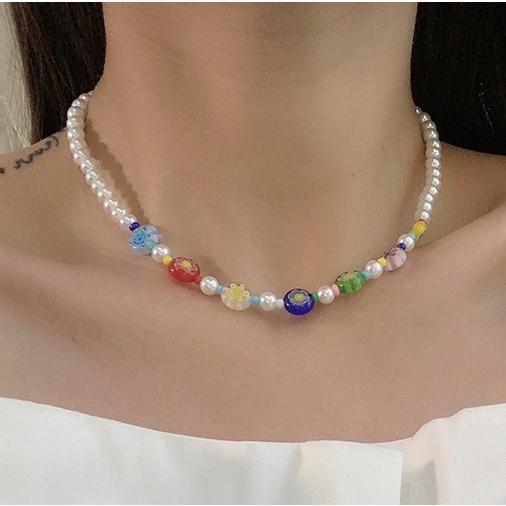 ネックレスチョーカーパールフラワービーズおしゃれかわいいカラフルレッド赤ピンクイエロー黄色オレンジブルー青パープルグリーン緑可愛いヒップホップレディースメンズガールズストリート韓国