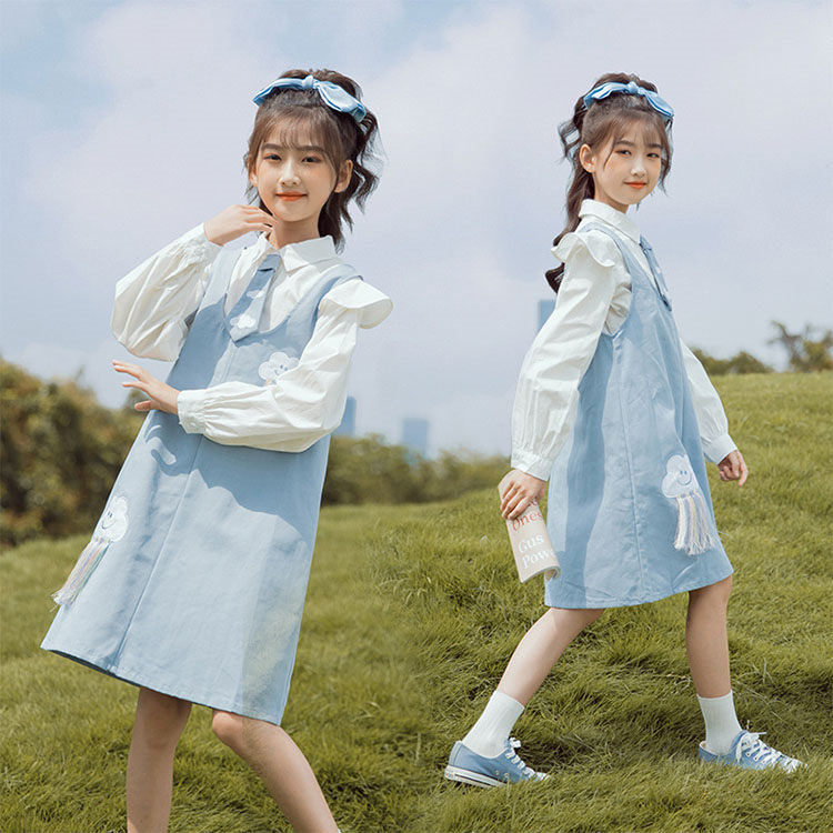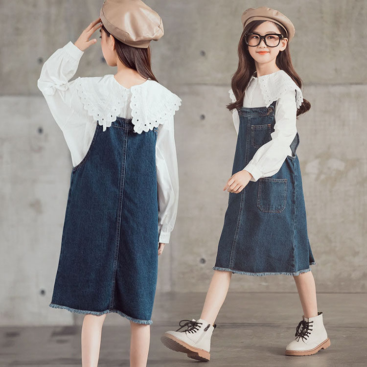 二点セット キッズ ホワイトシャツ+サロペットスカート デニムスカート ラペル 上品 おしゃれ 子供用 女の子 春 秋 おしゃれ お出かけ 可愛い 女児 通学 卒業式 小学生 130-165 -1
