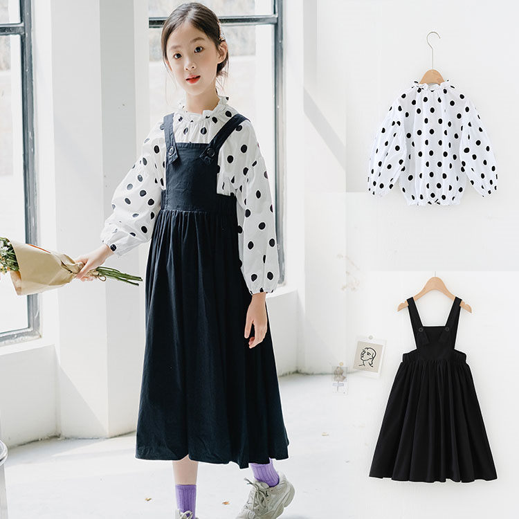 二点セット キッズ ドットシャツ+サロペットスカート ブラック 上品 おしゃれ 子供用 女の子 春 秋 おしゃれ お出かけ 可愛い 女児 通学 卒業式 小学生 120-165 TZ-1004