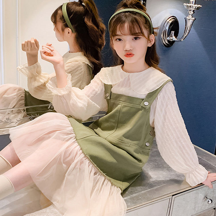 二点セット オフ ホワイトシャツ+サロペットスカート ラペル 長袖 おしゃれ 子供用 女の子 春 秋 グリーン おしゃれ お出かけ 通園 可愛い 女児 キッズ 通学 卒業式 小学生120-170 韓国