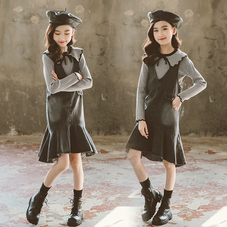 デニムスカートセット キッズ 子供服 Aライン 女の子 ラペル グレーセーター ブラックサロペットスカート ファッション きれいめ カジュアル 結婚式 おしゃれ 女児 可愛い お出かけ パーティー 学