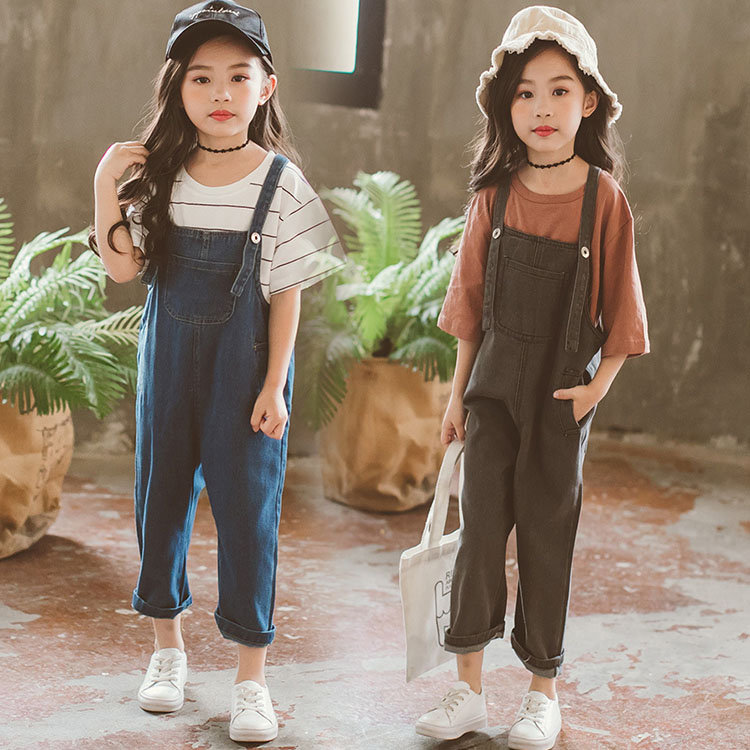 サロペット デニム ボトムス 長ズボン カジュアル 子供 キッズ 女の子 ファション 可愛い ダークグレー ダークブルー 100-160 ゆったり -896