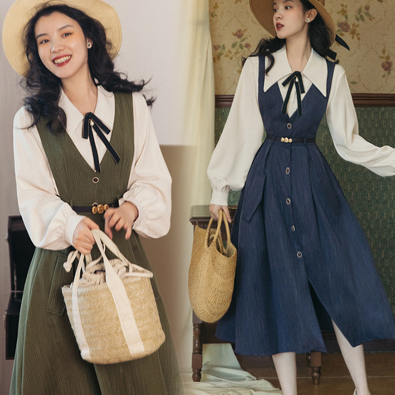 春 大きいサイズ レトロ レトロワンピース 冬 レディース ワンピース レディースセットアップ ジャンパースカート ブラウス 2点セット サロペット スカート 60年代 昭和レトロ きれいめ ミモレ丈