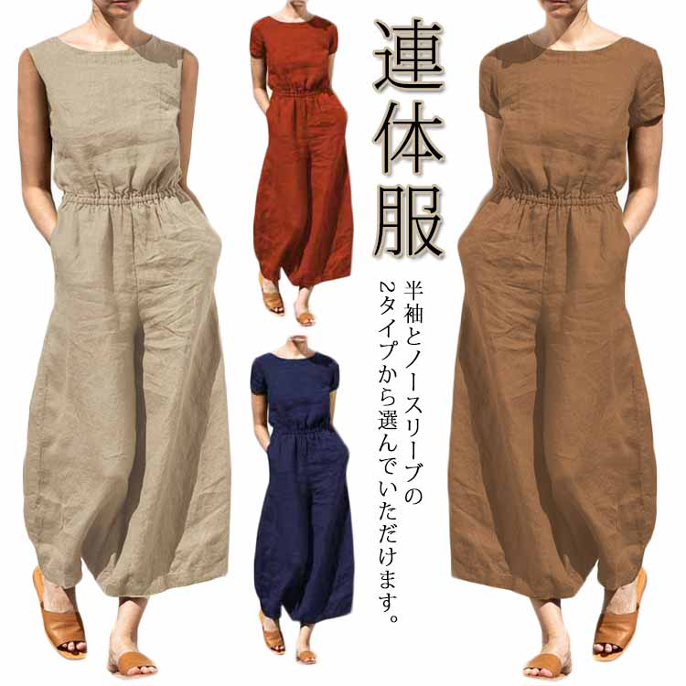 ウェストギャザー ノースリーブ ロンパース レディース ジャンプスーツ 定番 連体服 夏 ジャンプスーツ オールインワン