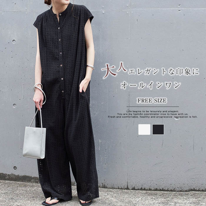 透かし編み つなぎ レディース フレンチスリーブ オールインワン レディース コンビネゾン オーバーオール サロペット ワイドパンツ ロングパンツ 連体服 裏地あり 黒 白 ホワイト