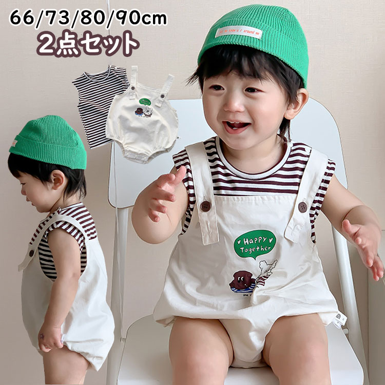 ベビー セットアップ 2点セット 夏 赤ちゃん 男の子 半袖シャツ サロペット ロンパース カバーオール 上下セット ボーダー柄 動物柄 おしゃれ お洒落 かわいい カジュアル 66 73 80 90