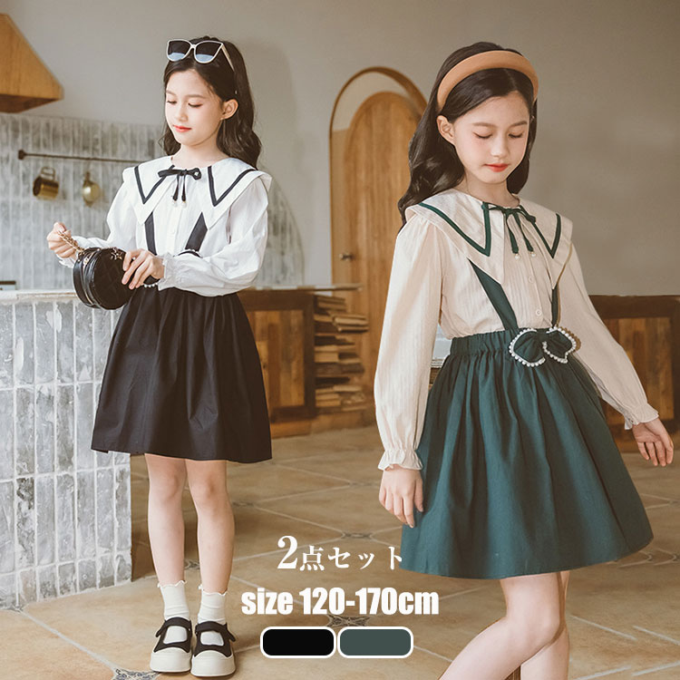 子供 ジャンパースカート 女の子 シャツ セットアップ サロペットスカート エレガント 蝶結び トップス ジュニア ブラウス フレアワンピース 上下セット フォーマル スカートセット トップス&ジャン