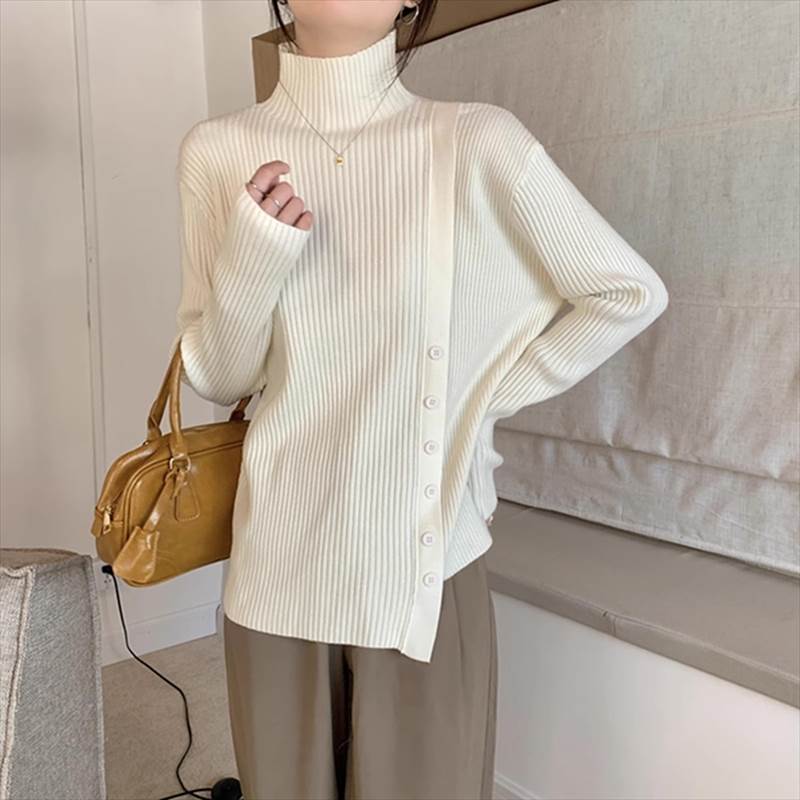 トップス ニット セーター レディース 長袖 ハイネック アシンメトリー フェミニン ボタン 中厚手 厚手 ニット リブニット 大人可愛い きれいめ シンプル 上品 おしゃれ かっこいい