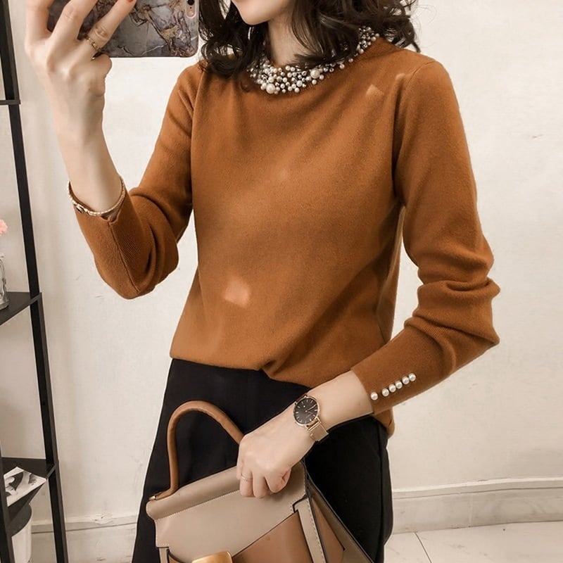 トップス 人気 おすすめ おしゃれ お洒落 激安 安い プチプラ ニット セーター レディース 長袖 ロング プル オーバー 細身 美シルエット ラウンドネック 丸首 無地 ビジュー