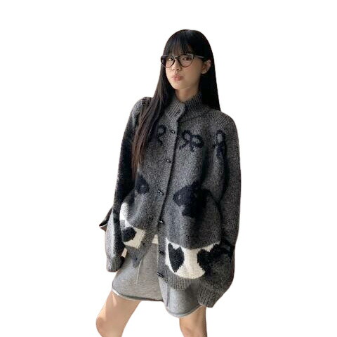 リボン柄ハート柄長袖トップスカーディガンニットセーターグレーホワイト白ブラック黒きれいめ キレイめ 上品 厚手 着痩せ おしゃれ 可愛い お呼ばれ お出かけ 通勤 普段着