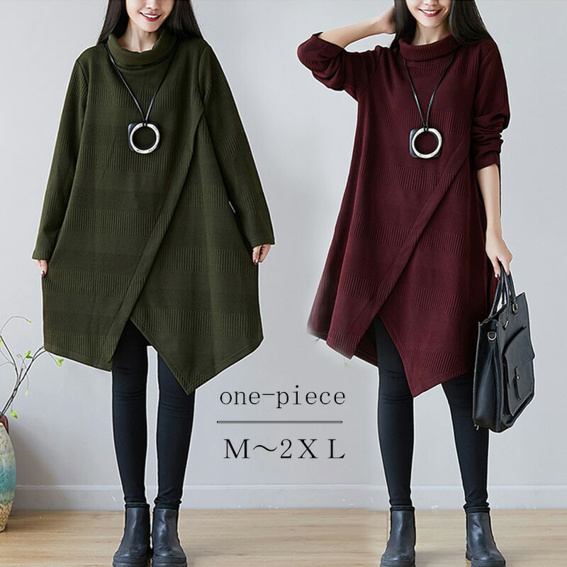 チュニック 秋物 長袖ワンピース 膝丈ワンピース レディース ハイネック ワンピース お洒落 秋冬インナーニットワンピ 織物