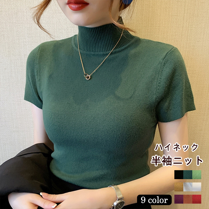 細見え効果あるリブニット 半袖 レディース サマーニット 薄手 キャミソール トップス 無地 ブラック ホワイト ピンク ベージュ ブラウン ハイネック