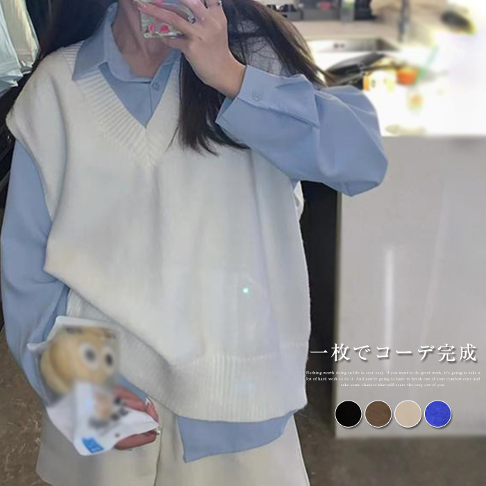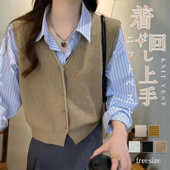 お手持ちのトップスに合わせるだけで、 こなれ感を演出♪ おしゃれなニットベストです Vネックでスタイルアップインナーに合わせて簡単にコーデ完成