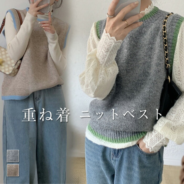 レイヤード風 重ね着 春 秋 冬 ゆったり ニットベスト 大人レディースファッション トップス ベスト ジレ