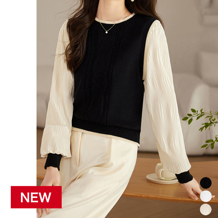シフォン袖 切り替えニットトップス パフスリーブ ニットプルオーバー 長袖 レイヤード風ニットブラウス クルーネック黒