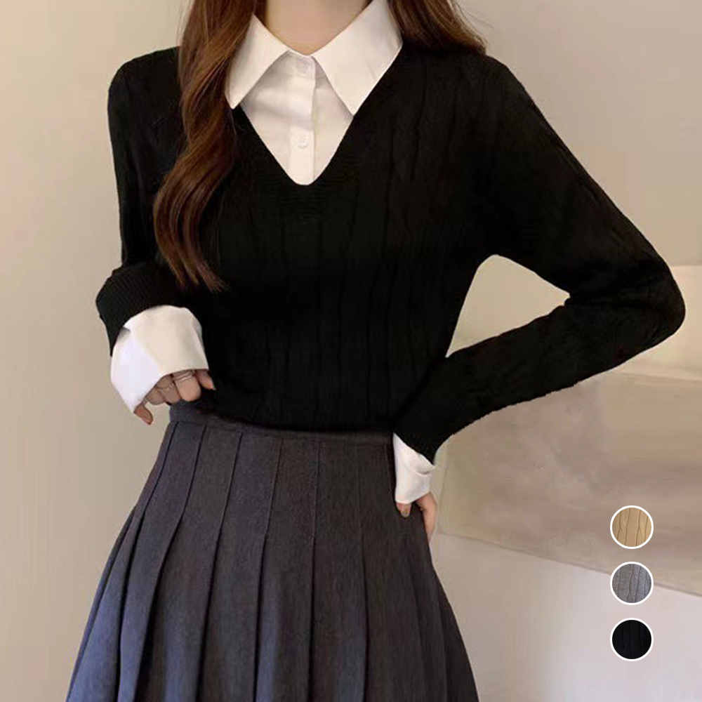 レディース 重ね着風 ドッキングニット シャツ襟切り替え ニットブラウス カジュアルニットソー 春秋冬ニットプルオーバー