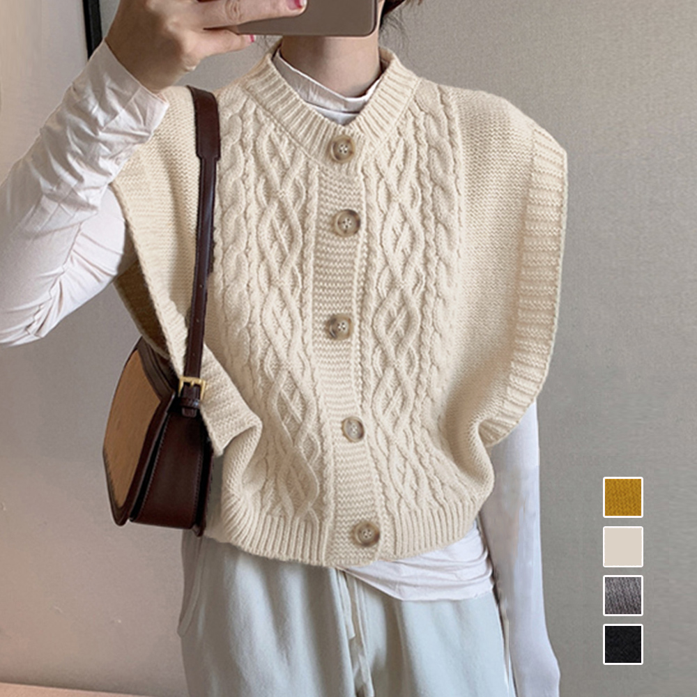 前開き チョッキ トップス フレンチスリーブ レイヤード風 重ね着 お洒落 ケーブルニット きれいめ 体型カバー 無地