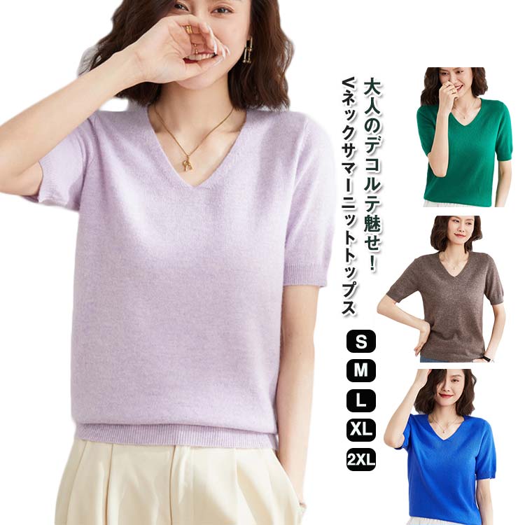サマーニット レディース ニット トップス Vネック 半袖ニット カットソー オフィス レディース カジュアル キレイめ 通勤 シンプル 無地 春