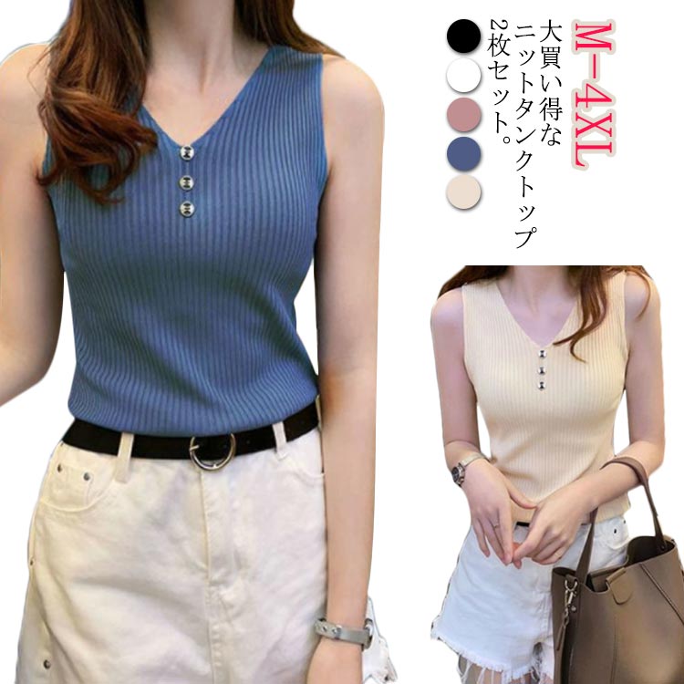 ニットタンクトップ 2枚セット 冷感 ひんやり サマーニット リブ ニット タンクトップ レディース Vネック ノースリーブ 薄手 インナー 春夏 夏服 シンプル コンパクト