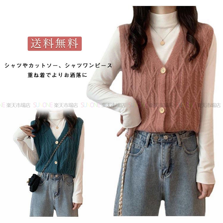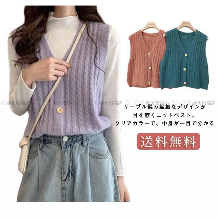 ノースリーブ 重ね着 ボダン付き レイヤード ショート丈 トップス カジュアル ゆったり 秋冬用 ニットベスト ベスト レディース ケーブル編み Vネック