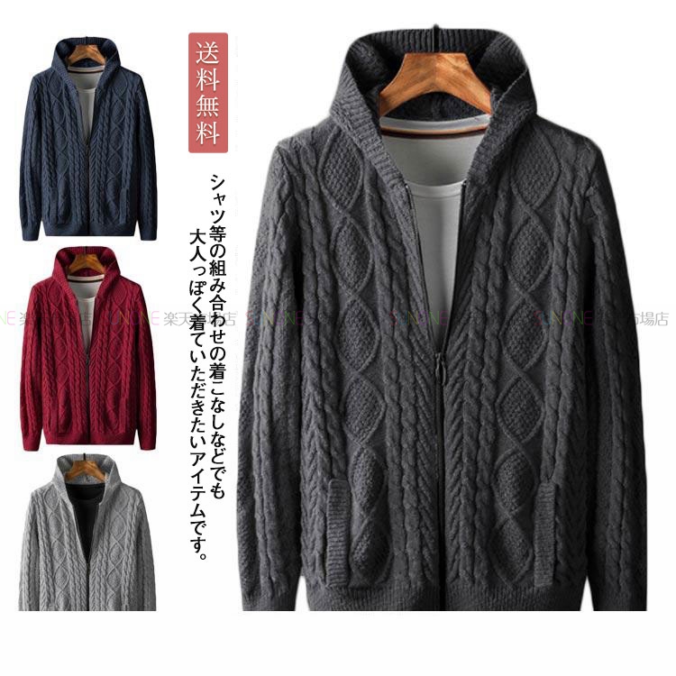 ニットカーディガン メンズ ニットセーター フード付き ジャケット トップス カーディガン セーター 無地 シンプル 防寒 ニットカーディガン メンズ ニットジャケット 長袖