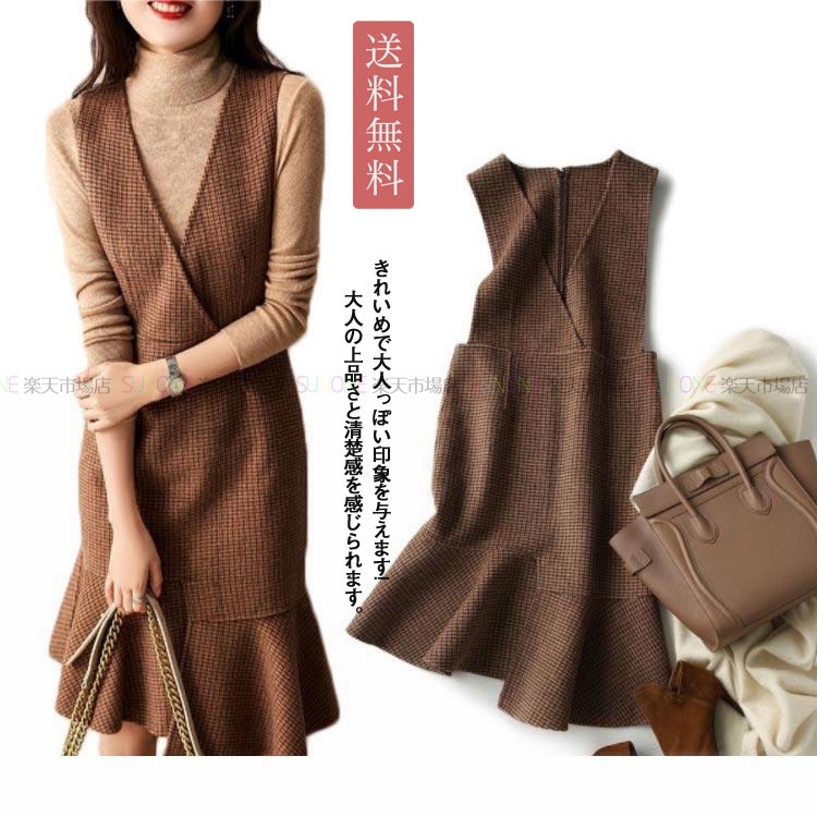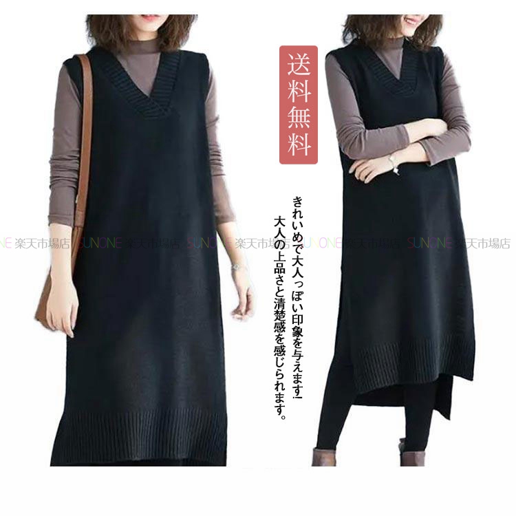 ニットワンピース ノースリーブ ジャンパースカート ロング丈 Vネック 無地 重ね着 秋 冬 体型カバー ベストワンピース レディース ニット ワンピース