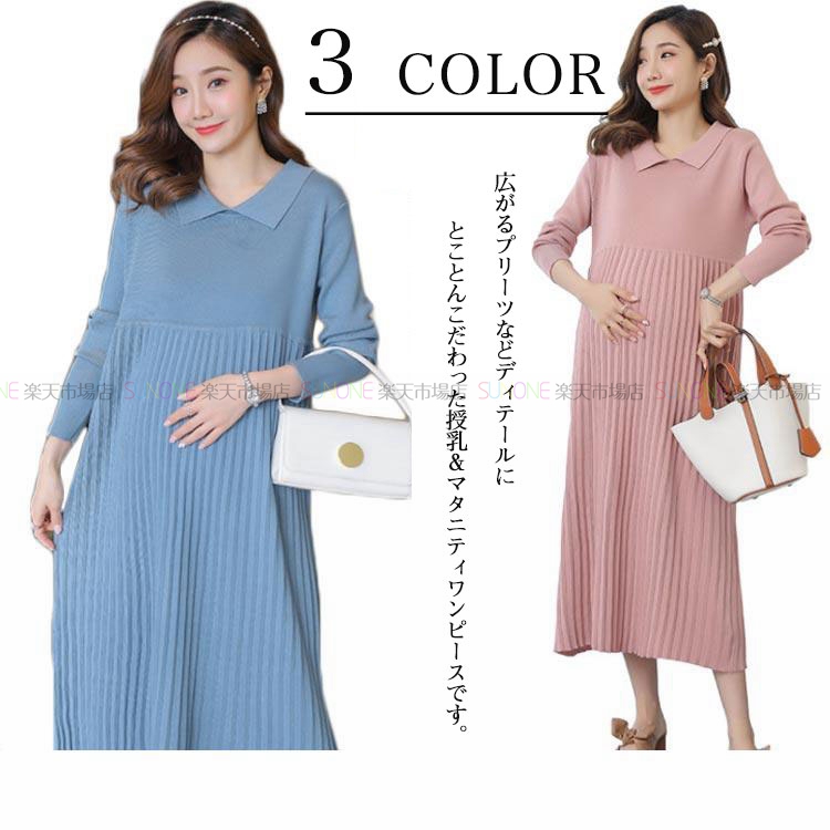 マタニティ ワンピース ニットプリーツ ワンピース マタニティウェア マタニティ 秋冬服 長袖 秋冬 授乳服 プリーツ バイカラー 無地 出産 産後