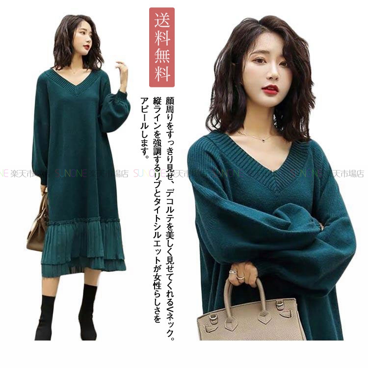 ニットワンピース ニット ワンピース レディース 秋冬 春 vネック 長袖 きれいめ ゆったり 大きいサイズ マタニティ 裾 切り替え プリーツ ロング丈 体型カバー 上品