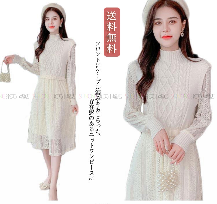 ドッキングワンピース ニットワンピース 秋冬 レディース ミモレ丈 ワンピ ロング丈 裾レース 長袖 Aライン 着やせ 切り替えワンピース コーデ OL エレガント