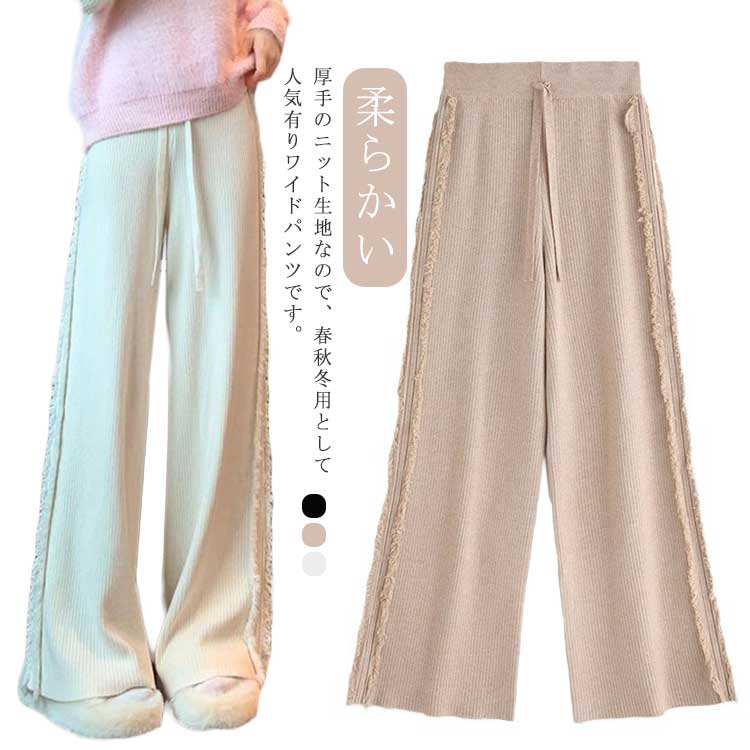 ニット ワイドパンツ レディース フリンジ ニットパンツ ストレートパンツ 調整ひも付き ガウチョパンツ 無地 ロングパンツ 秋冬
