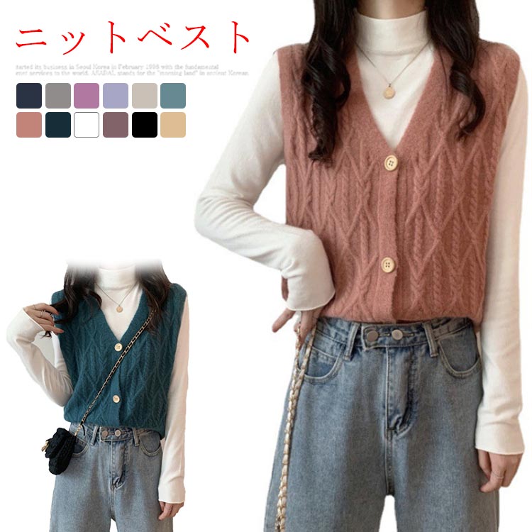 レディース Vネック トップス 前開き ケーブル編み ニットベストレディースファッション トップス ベスト ジレ