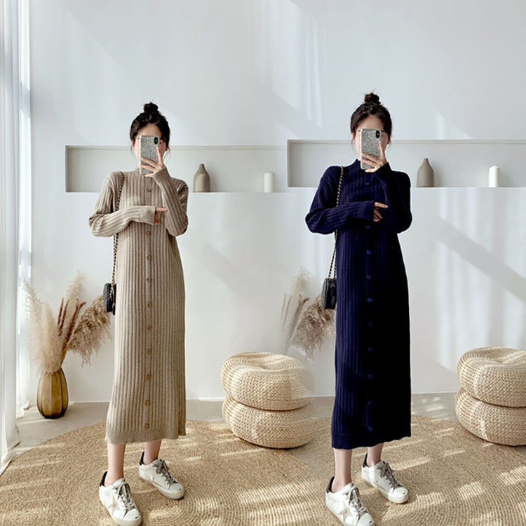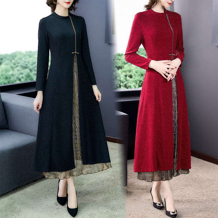 ワンピース 春 秋 長袖 ニット レッド ブラック チャイナドレス レディース 無地 Aライン きれいめ お出かけ ミモレ丈 ロングワンピ 上品 体型カバー ファッション ドレス エレガント ナチュラ