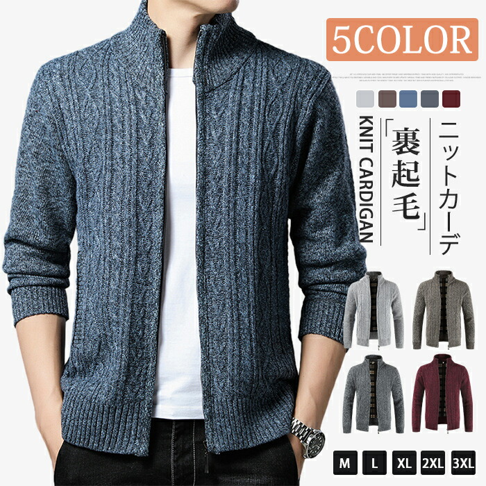 カーディガン メンズ ニットジャケット ニット アウター カーディガン ジップアップ ニットカーディガン 裹起毛 トップス 長袖 立ち襟 スタンドカラー 切り替え 厚手 防寒 あったか ジップアップ