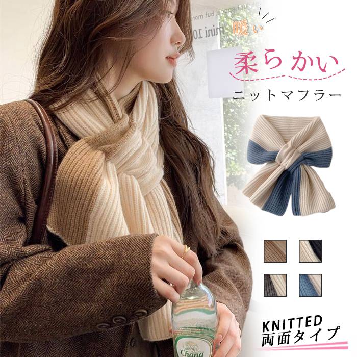 マフラー ニットマフラーリボン 配色 レディース ストール 差し込み クロス バイカラー 暖かい 秋冬 柔らかい 厚手 あったか かわいい おしゃれ