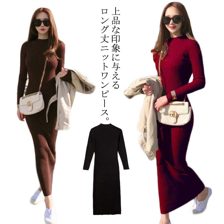 ニットワンピース レディース ロング丈 リブワンピース タイト すっきり 可愛い 大人 女っぽ 着痩せ 細見え シンプル 長袖 リブ ワンピース ニット