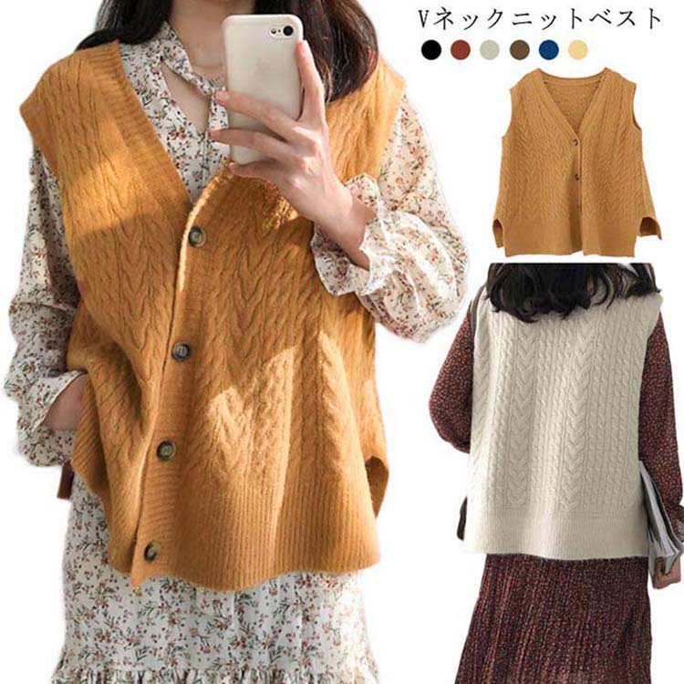 アウター 秋 秋物 ニットベスト レディース ケーブル編み ノースリーブ vネック タンクトップ トップス 重ね着風