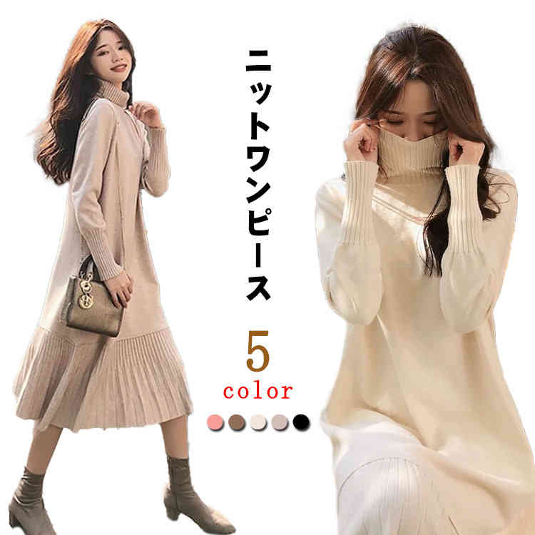 冬 体型カバ ニット ドッキング 秋 ワンピース ハイネック 無地 長袖 厚手 ワンピース レディース