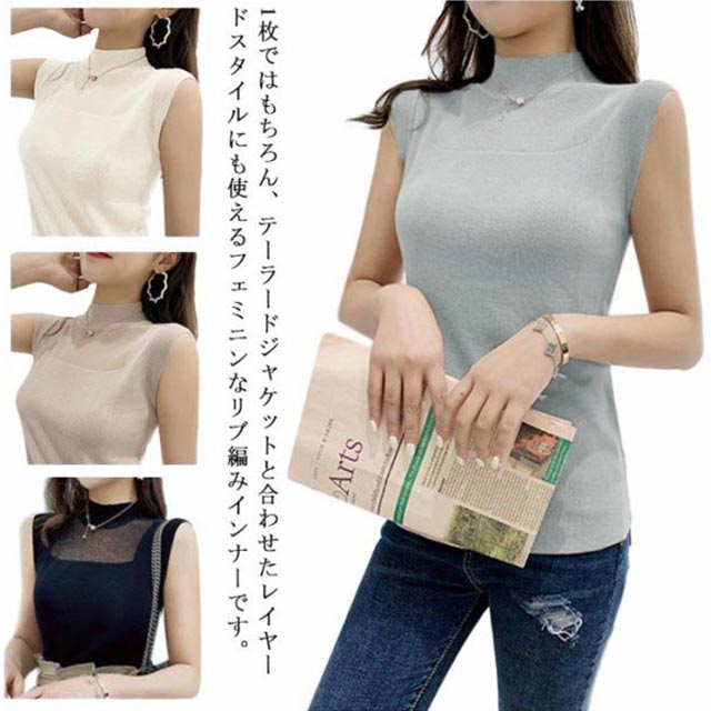 レディース フレンチスリーブ タートルネック サマーニット ニットトップス タイト シンプル シースルー 見せインナー タンクトップ