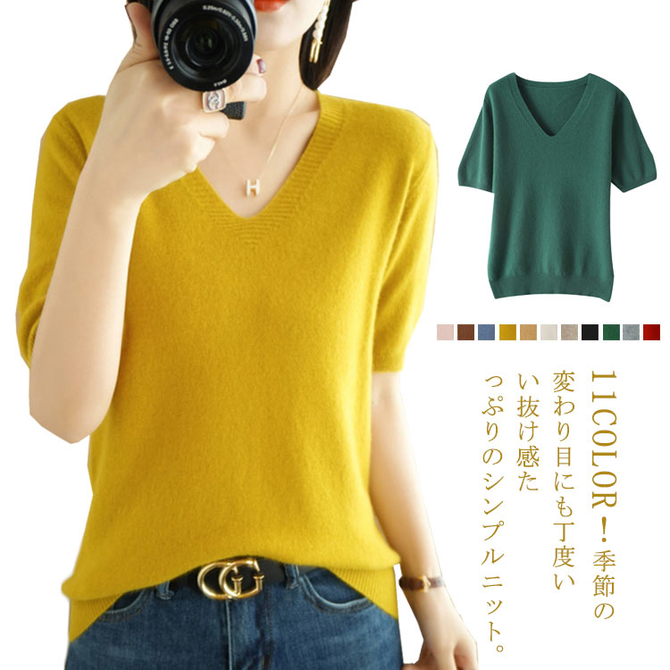 五分袖 11color レディース 軽い薄手 ニットセーター Vネック 5分袖 ゆったり ニット セーター Vネック サマーニット