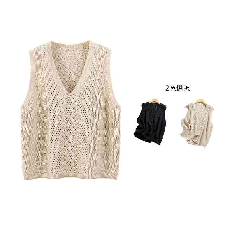 ニットベスト レディース 透かし編み Vネック プルオーバー ベスト 袖なし サマーニットレディースファッション トップス ベスト ジレ