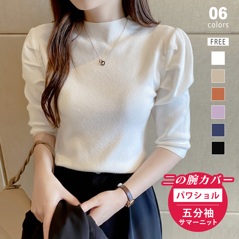 パワショル ニット ハイネック 五分袖 パワーショルダー トップス レディース サマーニット パワショルニット 半袖 パフスリーブ 無地 オフィスカジュアル フェミニン きれいめ 上品 大人 春夏