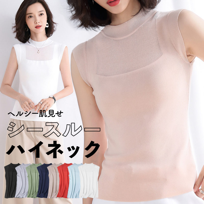 ハイネック シースルーニット フレンチスリーブ ノースリーブ シアー ハイネック 透け ニット サマーニット トップス レディース 春 夏 秋