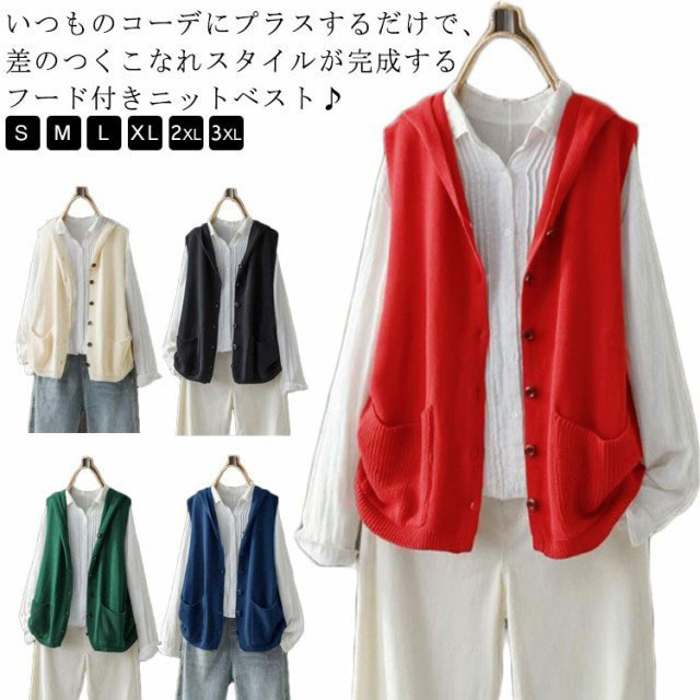 ニットフードベスト パーカー フード付き レッド ノースリーブ ブラック グリーン ベージュ ニットベスト